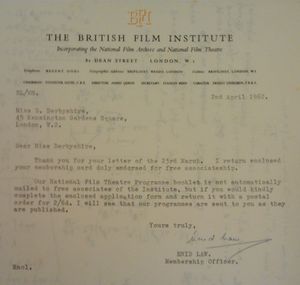 [[DD073220]] is a letter dated 2nd April 1962 from The British Film Institute to Delia about her membership. | [[DD073220]] is a letter dated 2nd April 1962 from The British Film Institute to Delia about her membership. | ||