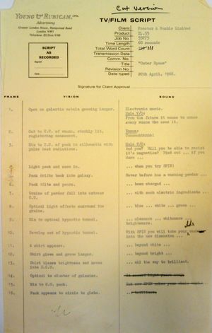 DD091922 is a "cut version" of a TV/Film Script by Young & Rubicam Ltd. (Advertising) for Proctor & Gamble entitled Outer Space for which Delia is to create the piece Spin.