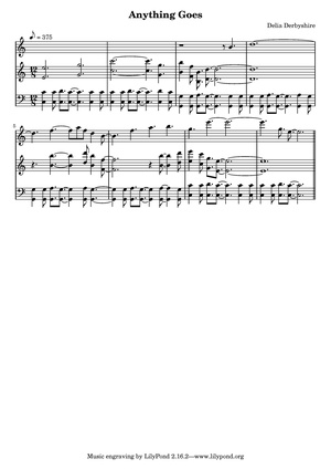 | − | + | Delia's papers contain her handwritten score for it<ref name=DD120020>[[DD120020]]: Delia's handwritten score for [[Anything Goes]].</ref> and here it is, typeset and as MIDI. | |