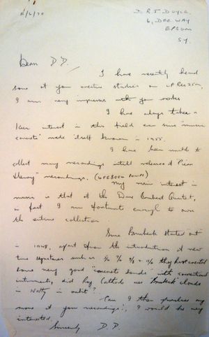 DD141820 is a letter dated 15th June 1970 from D. R. J. Doyle to Delia, mentioning LP REC25M (BBC Radiophonic Music) and Dave Brubeck and requesting more of her music.