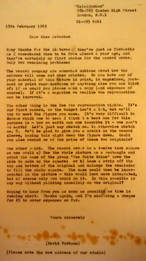 DD164714 is a letter dated 15th February 1969 from David Vorhaus to Miss Astrahan about her cover art for An Electric Storm and giving Kaleidophon's "new address".