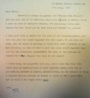 Jump to navigationJump to searchDD102148 is a letter dated 21st July 1970 to Delia "herewith cheque for Poetry from Prison..."