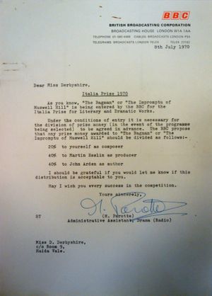 Jump to navigationJump to searchDD141636 is a memo dated 8th July 1970 from M. Parotte to Delia about distribution of the prize money should The Bagman win the Italia Prize.