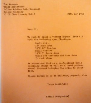 Jump to navigationJump to searchDD165330 is a letter dated 24th May 1969 from Delia to Dallas Arbiter Ltd. ordering a 'George Hayman' four-piece drumkit.