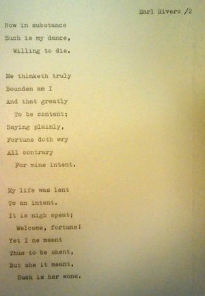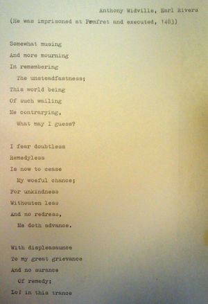 Jump to navigationJump to searchA poem by Earl Rivers (given name Anthony Widville or Woodville) was one of those proposed to Delia to set to music for Poets in Prison.